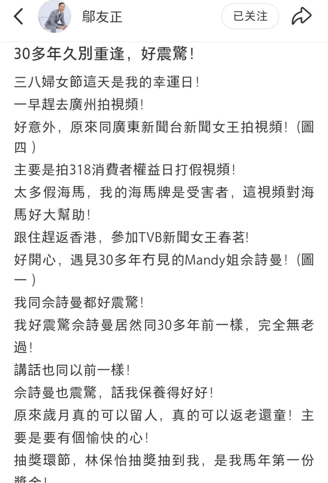 另一边,港姐冠军翁嘉穗的丈夫、海马床褥老板邬友正也在社交媒体上晒出与佘诗曼重逢的合照。他透露,当天自己先赶往广州拍摄视频,之后匆忙回港参加春茗。让他惊喜的是,三十多年没见,佘诗曼依旧容颜如初;而她也夸他保养得非常好。更巧的是,在抽奖环节,林保怡亲自抽中邬友正——成为他今年的“第一份喜气”。